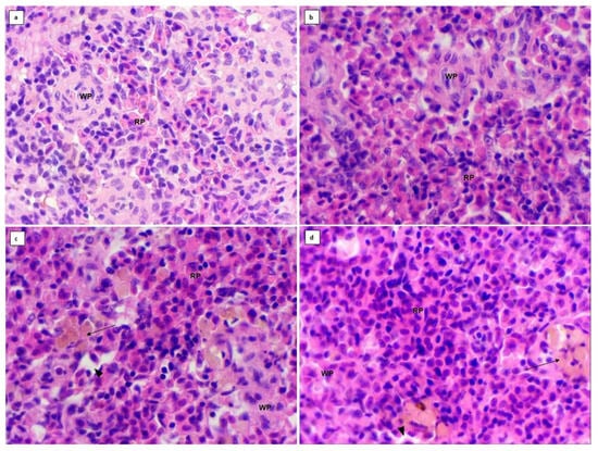 Spleen histopathology of Nile tilapia, stained with hematoxylin and eosin, where bar = 100 µm. RP = red pulp; WP = white pulp. (a) Control group showed normal structure of red pulp (RP) and white pulp (WP). (b) MinazelPlus® group showed normal structure of red pulp (RP) and white pulp (WP). (c) Mycotoxin group showed marked lymphoid depletion (arrowheads) with melanomacrophage centers (arrows). (d) Mycotoxin and MinazelPlus® group showed mild degree of lymphoid depletion (arrowheads) and low density of melanomacrophage centers (arrow).