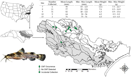 - Tracy, B.H.; Rohde, F.C.; Smith, S.A.; Bissette, J.L.; Hogue, G.M. A Guide to North Carolina’s Freshwater Fishes; The University of North Carolina Press: Chapel Hill, NC, USA, 2024. [Google Scholar]