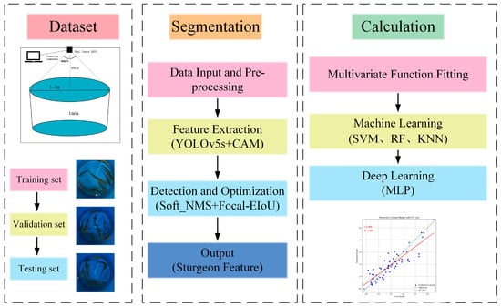 Figure 1 illustrates an overview of the proposed weight estimation framework for the sturgeon, segmented into three main components: dataset, segmentation, and calculation. Firstly, sturgeon images are acquired using an image acquisition device and subsequently partitioned into training sets, validation sets, and test sets. Secondly, the segmentation phase involves image preprocessing followed by sturgeon feature extraction using an enhanced YOLOv5s model with the context augmentation module (CAM). Additionally, optimization techniques such as soft non-maximum suppression (Soft-NMS) and focal-efficient intersection over union loss (Focal-EIoU) are employed to obtain precise segmentation outputs. Finally, at the calculation stage, three methods are used to estimate sturgeon weight from extracted features. The first involves multivariate function fitting to capture weight relationships. The second uses machine learning algorithms—support vector machine (SVM), random forest (RF), and k-nearest neighbors (KNN)—to offer a broader comparison. Lastly, a deep learning approach with a multilayer perceptron (MLP) is employed for enhanced predictive accuracy.