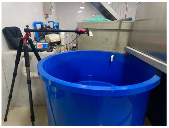 The collection of pictures and weighing of sturgeons were conducted at the Fisheries Science Institute, Beijing Academy of Agriculture and Forestry Science between April 2022 and October 2023 [,]. The picture data acquisition was completed using an Intel Real Sense D455 Stereo Depth Camera. To minimize the effects of glare and reflections caused by the water surface, a 30mm MCCPL polarizing filter (NiSi, Zhuhai, China) was affixed in front of the RealSense D455 camera. Pictures of each specimen were taken at 90 frames per second, and the auto exposure mode employed the color image sensor and the infrared sensor. The field of view for the color image was 86° × 57° (H × V) with a resolution of 640 × 480, whereas the field of view for the depth image was 87° × 58° with a resolution of 640 × 480 []. Figure 2 shows that the camera was mounted 0.8–1.2 m above the tank, vertically aligned with the water surface to capture images at varying distances []. Camera parameter calibration was autonomously performed on site using Intel®Depth Quality Tool software v2.50.0 []. Images of sturgeons in various swimming postures, group sizes, body sizes, lighting conditions, and distances were collected to improve the model’s generalization.