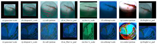 Two datasets were established: the sturgeon dataset and the occlusion dataset. The sturgeon dataset was used for model pre-training to obtain the pre-trained weight file, whereas the occlusion dataset was used for model training. The number of images in the dataset is shown in Table 1. The sturgeon dataset included 100 sturgeons, representing five species: Acipenser baerii, Acipenser schrenckii, Acipenser ruthenus, Acipenser gueldenstaedtii, and hybrid sturgeons. A total of 4000 images were captured, and 40 images were taken per sturgeon []. To minimize redundancy and avoid overfitting due to high similarity between frames, the structural similarity index (SSIM) algorithm was applied, and the sturgeon dataset was reduced to 1974 images. Data labeling was conducted on the obtained images using LabelImg software 1.8.6, and the corresponding TXT files were generated []. Training deep convolutional neural networks requires a large number of data. Extremely limited numbers of data can result in underfitting or overfitting of deep convolutional neural networks. To enhance the diversity of the sturgeon images, various transformations were applied using Python scripts with the imgaug library for data augmentation. This approach augments dataset variability by simulating diverse conditions and mitigates overfitting risks, ultimately enhancing the model’s generalization ability and accurate recognition of sturgeons in different aquaculture environments. The methods used for image enhancement are shown in Figure 3 []. The sturgeon dataset contained 3948 sturgeon images after enhancement. For the occlusion dataset, 40 sturgeons, including Acipenser gueldenstaedtii and Acipenser ruthenus, were grouped and placed in a round fish tank. Twenty images were captured per group, resulting in 800 images. The SSIM algorithm was then used to select 420 occlusion images, which were further augmented using the imgaug library. Finally, the occlusion dataset contained 1020 images for segmentation experiments. The sturgeon dataset and the occlusion dataset were divided into training, validation, and test sets in an 8:1:1 ratio to ensure a balanced evaluation for training deep convolutional neural networks [].