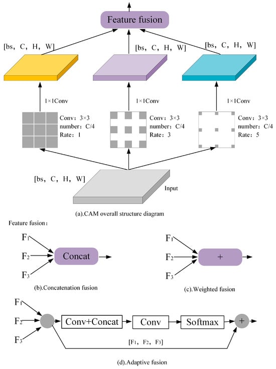 The structure of CAM. (a) CAM overall structure diagram; (b–d) three different feature fusion methods. Adaptive fusion is what we use.