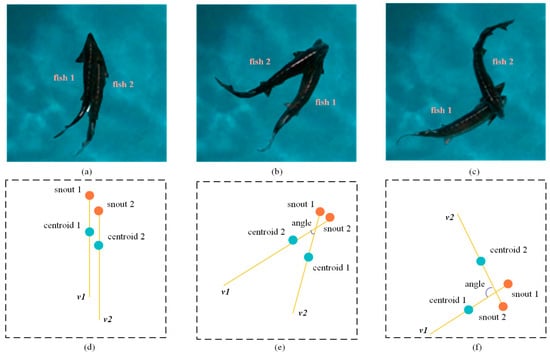 The schematic diagram of occlusion sturgeon classification. The orange dots indicate the sturgeon’s snout, the blue dots indicate the sturgeon’s centroid, and the yellow line represents the vector corresponding to the sturgeon. The angle between two vectors is the occlusion angle that we define. (a,d) the I-shaped occlusion; (b,e) the II-shaped occlusion; (c,f) the III-shaped occlusion.