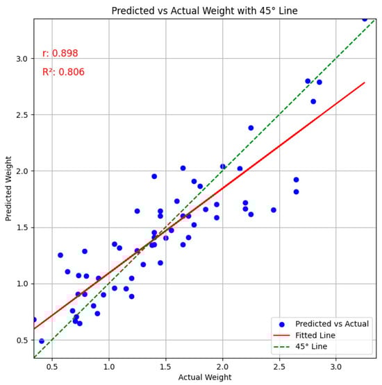 The MLP model achieved the highest correlation coefficient of 0.898 and demonstrated superior predictive ability with an MSE of 0.148, indicating a low prediction error. Therefore, the MLP algorithm is the most effective approach for sturgeon weight inversion. The results of the weight prediction model based on the MLP are shown in Figure 7.