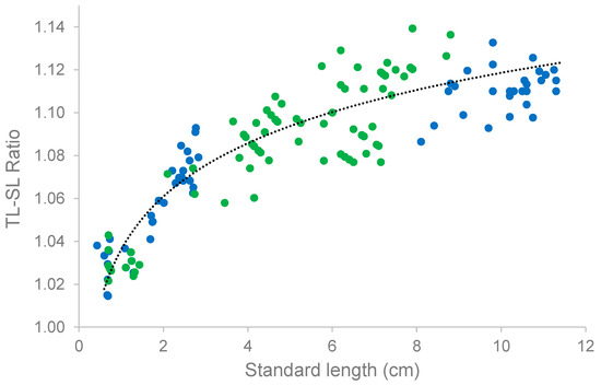The relationship between the TL-SL Ratio and SL in cultivated capelin below the age of 260 dph. The regression line is expressed as TL-SL Ratio = αln(SL) + β, with a calculated slope (α) of 0.036, an intercept (β) of 1.036, and a coefficient of determination (R2) of 0.85. Blue dots depict data from the current study and green dots represent data from other laboratory studies at the ARS.