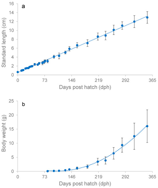 The progression in average total length ± SD from hatching to day 351. The dotted line represents the regression line: SL = 0.0361dph + 0.5374 (a) (modified from Árnason et al. [52]). The growth in weight from day 81 to 351. Weight data are fitted with a second-order polynomial: W = 0.0003dph2 − 0.0588dph + 3.274 (b).