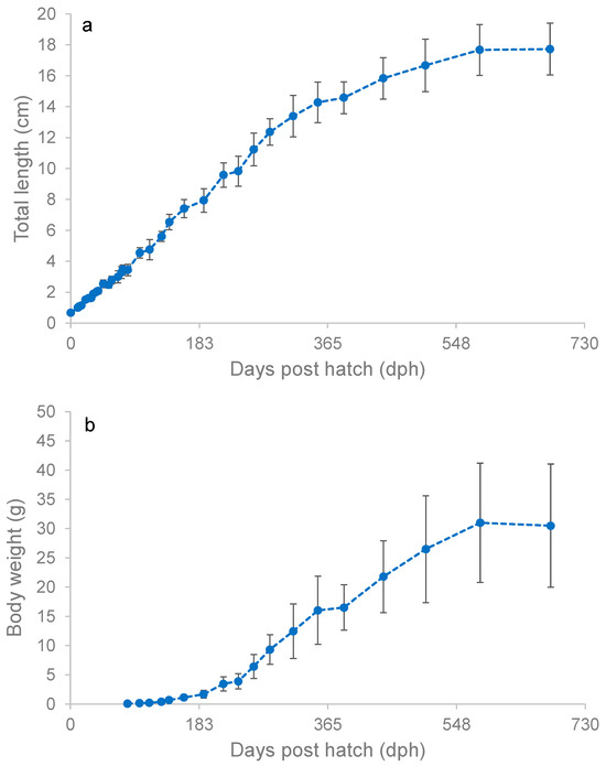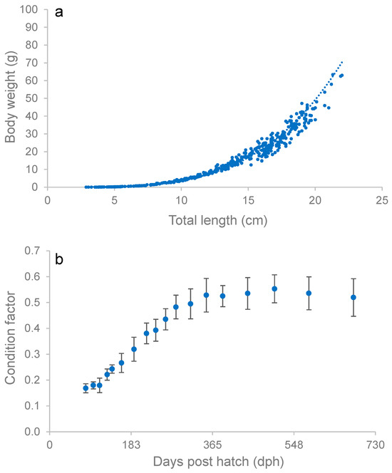 During the second year post-hatch, the post-larval length trajectory deviated from linearity and gradually approached L∞. The final measurement on day 681, which included all remaining fish, showed an average TL of 17.7 ± 1.7 cm (Figure 4a). A subgroup (Group B) reared under identical conditions in a separate tank had a slightly higher mean TL of 18.0 ± 1.7 cm on day 942.