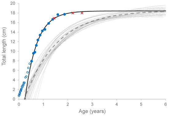The von Bertalanffy growth analysis of cultivated capelin (black line) with the mean total lengths of metamorphosed capelin in groups A (●) and B (×). The model was exclusively fitted to the growth of metamorphosed capelin, excluding translucent capelin (օ). The cultivated capelin’s growth curve parameters t0, K and L∞ were 0.25, 2.06, and 18.4, respectively. Thin grey lines represent wild Icelandic capelin from year-classes 1981–2018, while the dashed line shows the growth curve derived from the median von Bertalanffy parameters of these wild cohorts (median t0 = 0.24, K = 0.75, L∞ = 18.6).