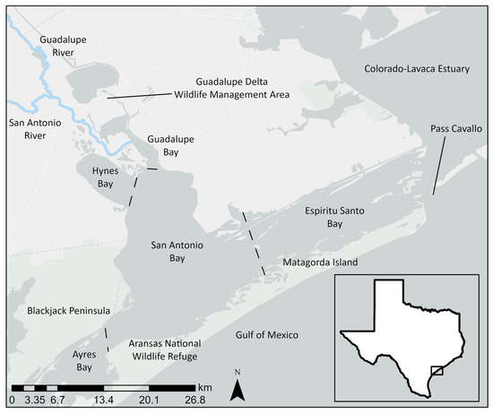 Water exchange also occurs with the Colorado-Lavaca Estuary (Matagorda Bay) to the northeast and the Mission-Aransas Estuary to the southwest (Aransas Bay and Copano Bay). Freshwater inputs from the Guadalupe and San Antonio Rivers flow along the western boundary of the bay toward the Aransas National Wildlife Refuge along the Blackjack Peninsula, whereas waters from the Gulf of Mexico enter primarily through Pass Cavallo and penetrate San Antonio Bay from the east—through Espiritu Santo Bay [34]. The SABS is directly adjacent to three counties: Aransas, Refugio, and Calhoun, with a total human population of 50,677 people [35]. Land use in these counties is primarily agricultural (39% or 1456 km2), while developed land accounts for only 4% of the land area (148 km2). Upland habitats of scrub shrub (woody vegetation less than or equal to 5 m in height), forested, and grassland habitats cover 30% of the land area (1224 km2), while woody and emergent wetlands comprise 25% (1006 km2) of the land [36].
