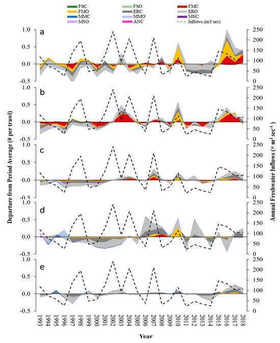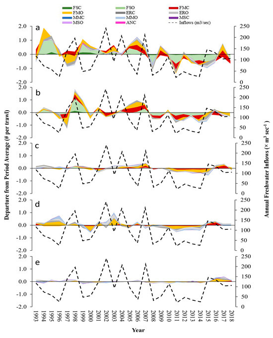 Functional group abundance departure from the average for species captured in otter trawls (1993–2018) in the San Antonio Bay System: (a) Guadalupe Bay, (b) Hynes Bay, (c) San Antonio Bay, (d) Ayres Bay, and (e) Espiritu Santo Bay. Annual freshwater inflows (dashed line; ×109 m3 yr−1) were defined as “Low” or “High” relative to the median annual inflow from 1993 to 2018.