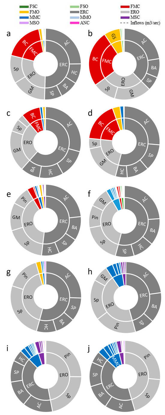Otter trawl average species abundance by functional group in each sub-bay during low (left) versus high (right) inflow in the San Antonio Bay System, respectively. (a,b) Guadalupe Bay, (c,d) Hynes Bay, (e,f) San Antonio Bay, (g,h) Ayres Bay, and (i,j) Espiritu Santo Bay. Functional groups (color coded) are shown in the inner circle and the corresponding fish species are given in the outer circle. Full fish names are given in Table S1, along with the abbreviations used in this figure. The most common fish named in alphabetical order are Atlantic croaker (AC), bay anchovy (BA), blue catfish (BC), gafftopsail catfish (GC), Gulf menhaden (GM), hardheaded catfish (HC), pinfish (Pin), silver perch (SP), and spot (Sp).