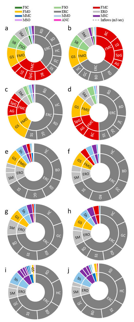 Gill net average species abundance by functional group in each sub-bay during low (left) versus high (right) inflow in the San Antonio Bay System, respectively. (a,b) Guadalupe Bay, (c,d) Hynes Bay, (e,f) San Antonio Bay, (g,h) Ayres Bay, and (i,j) Espiritu Santo Bay. Functional groups (color coded) are shown in the inner circle and the corresponding fish species are given in the outer circle. Full fish names are given in Table S1, along with the abbreviations used in this figure. The most common fish named in alphabetical order are alligator gar (AG), black drum (BD), blue catfish (BC), gafftopsail catfish (GC), gizzard shad (GS), hardheaded catfish (HC), longnose gar (LG), red drum (RD), sheepshead (Sh), smallmouth buffalo (SB), spotted gar (SpG), spotted seatrout (SS), and striped mullet (SM).