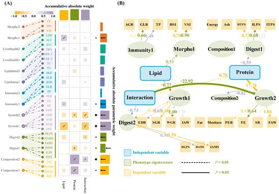 Potential regulatory patterns in Furong crucian carp. (A) Correlation analysis based on the Spearman coefficient was used for the interactions between the module eigengenes extracted from the matrix of the main and interaction effects of dietary lipid and protein inclusion levels and the secondary module eigenvectors extracted from the phenotype matrix. The presence of ‘*, **, ***’ indicated the significant difference level at 0.05, 0.01, and 0.001, respectively. The different size of diamond represented that the number of significant pairwise comparison in each row of the heat map. The arrow stated that at least one significant pairwise comparison was observed in the corresponding row; (B) structural equation model. The structural equation model explains as much variance as possible in the variables in the model while understanding the covariance between the variables.
