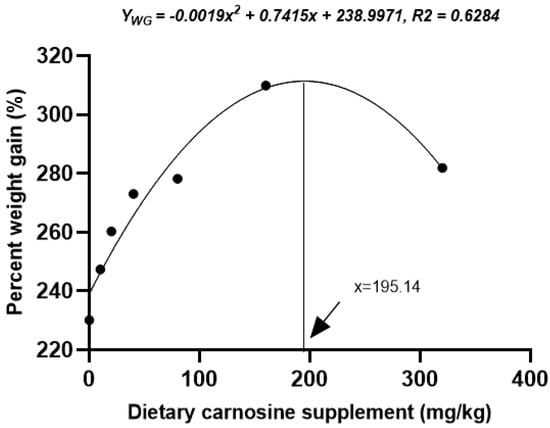 23]. The results of our current study displayed that the growth of grouper had a dose–response relationship in response to the carnosine concentration in feed, with a lowest growth occurring for the basal diet without carnosine addition. This finding indicates that the growth of grouper could benefit from appropriate carnosine addition, which was similar to what has been reported in previous studies with broiler chicken [