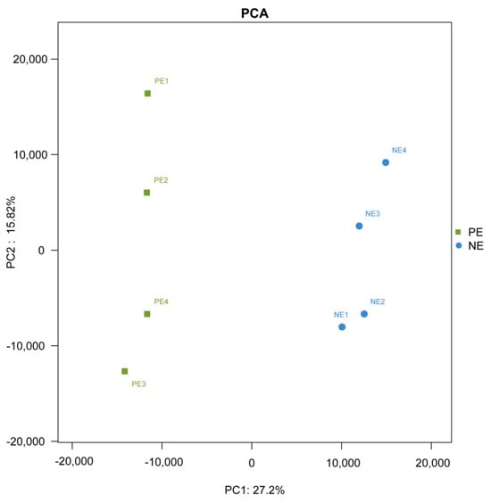 PCA indicated a variation of 43.02% at the proteome level. Inter- and intra- group variations at the proteome level were demonstrated by PC1 and PC2, respectively. The PCA results for the DEPs between the PE and NE groups indicated that the samples in each group clustered together, and the two groups were clearly separated (Figure 1).