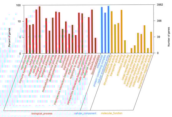 DEPs in the eyestalks of samples from the PE group were significantly enriched (p < 0.05) in 852 GO terms. The most enriched biological process items were the “cellular process”, “metabolic process”, and “multicellular organismal process”. The most enriched cellular components were “intracellular”, the “protein containing complex”, and “cellular anatomical entity”. The dominant molecular function included “binding”, “catalytic activity”, “transporter activity”, and “structural molecule activity” (Figure 2).
