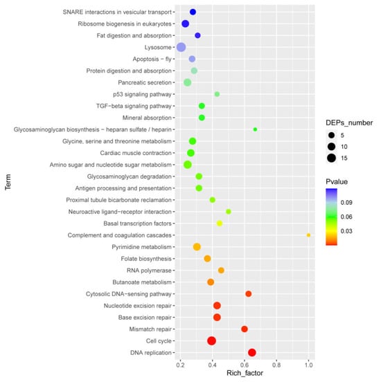 According to KEGG pathway enrichment analyses, DEPs were significantly enriched in “DNA replication”; the “cell cycle”; “mismatch repair”; “base excision repair”; the “cytosolic DNA-sensing pathway”; “butanoate metabolism”; “RNA polymerase”; “pyrimidine metabolism”; “amino sugar and nucleotide metabolism”; and “glycine, serine, and threonine metabolism” (Figure 3).