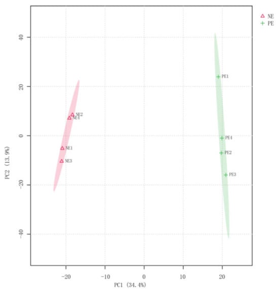 A total of 1317 unique metabolites were identified using untargeted metabolomics LC-MS (Supplementary Table S3). An orthogonal partial least squares discriminant analysis (OPLS-DA) mode was employed to filter the DMs. In the OPLS-DA score plot, samples from the PE and NE groups can be easily distinguished (Figure 4).