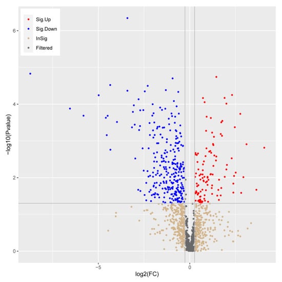 Volcano plots of DMs for the precocious group and normal juvenile group. The x-axis and y-axis represent fold change and −log10(p-value), respectively. In the volcano plot, red dots, blue dots, tawny dots, and grey dots represent significant up-regulated, significant down-regulated, non-significant different metabolites, and fitered metabolites, respectively.