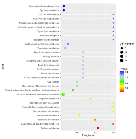 The KEGG pathway enrichment analysis showed that different metabolites were enriched in “carbon metabolism”, “glyoxylate and dicarboxylate metabolism”, “fatty acid biosynthesis”, “glutathione metabolism”, the “pentose phosphate pathway”, “porphyrin metabolism”, the “biosynthesis of alkaloids derived from histidine and purine”, “fat digestion and absorption”, and “fatty acid elongation” (Figure 6).