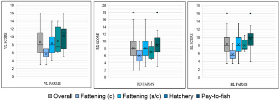 Figure 3. Graphical representation of the boxplots of the mean VL, RD, and BL scores of the farms in the 4 strata, separated by color according to the image legend.