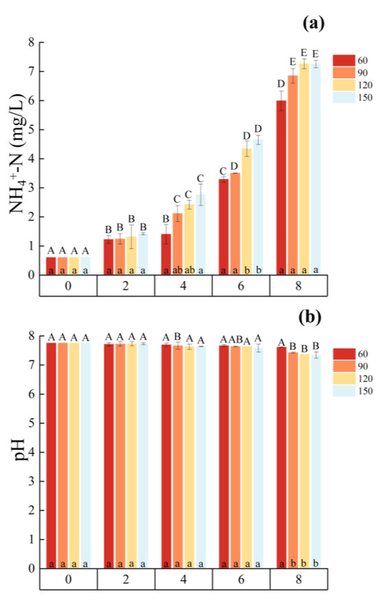 Water quality parameters including (a) NH4+-N (unit: mg L−1), (b) pH, and (c) DO (mg L−1) for different density groups (60, 90, 120, and 150 kg m−3 represented by the red, reddish brown, light yellow, and light blue bars, respectively) after different transport durations (0, 2, 4, 6, and 8 h). Different uppercase letters indicate significant differences between different transport durations within the same density group (p < 0.05). Different lowercase letters indicate significant differences between different density groups at the same transport duration (p < 0.05). The same is true for subsequent figures.