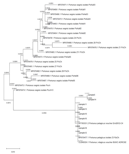 - Bagheri, H.; Khalilian, S.; Pazira, A.; Rezanejad, M. Phylogenetic relationships and genetic diversity of the blue swimming crab (Portunus pelagicus) populations in the Persian Gulf and Gulf of Oman based on mitochondrial DNA markers. Iran. J. Fish. Sci. 2020, 19, 942–959. [Google Scholar]
