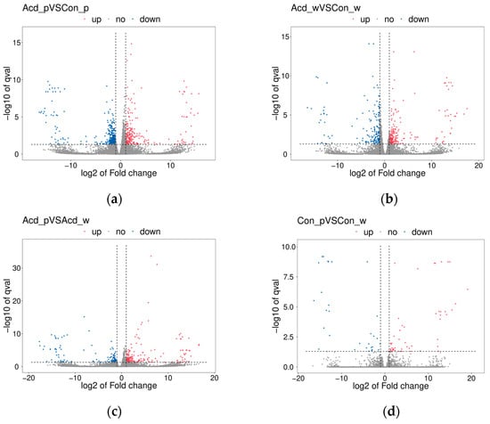 Volcano plots showing the DEGs between comparisons. (a) Acd_p vs. Con_p; (b) Acd_w vs. Con_w; (c) Acd_p vs. Acd_w; (d) Con_p vs. Con_w. Acd, acidification group; Con, control subject; p, clams with purple shell color; w, clams with white shell color. Red plots represent upregulated genes; blue plots represent downregulated genes; and grey plots represent non-significantly differentially expressed genes.