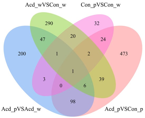 The numbers of DEGs unique to each pairwise comparison, as well as those shared among multiple comparisons, were summarized using a Venn diagram (Figure 2). Among the DEGs, one unigene was significantly differentially expressed in all groups. There were 39 shared DEGs between Acd_w vs. Con_w and Acd_p vs. Con_p, respectively; most of these genes correspond to lipid metabolism, tyrosine metabolism, and the heat shock protein family.