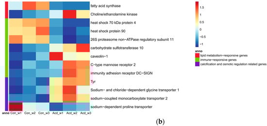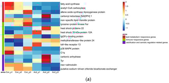 To investigate the expression levels of the OA-responsive genes we focused on, further analysis was conducted by creating a hierarchical cluster. The expression profiles of the DEGs were categorized into three main clusters (lipid metabolism-responsive genes, immune-responsive genes, and calcification- and osmotic regulation-related genes) for two color populations under OA stress (Figure 3). The expression of fatty acid synthase (FASN), a key gene related to fatty acid biosynthesis, showed significant downregulation in both two acidification groups, while acetyl-CoA carboxylase (ACC) was also observed to be downregulated in clams with purple shell color. On the other hand, genes related to shell formation and osmotic regulation were upregulated in M. veneriformis under OA stress. Among them, the tyrosinase gene (TYR) was significantly expressed in both acidification groups; carbonic anhydrase (CA) and several members of the solute carrier family were upregulated in the purple shell-color and white shell-color groups, respectively. The expression levels of some immune-responsive genes were found to be upregulated in both shell-color groups under pH 7.6 conditions, suggests that OA stress activates these genes to mitigate damage to itself. Interestingly, we observed an opposite expression pattern of heat shock proteins in the two distinct color groups.