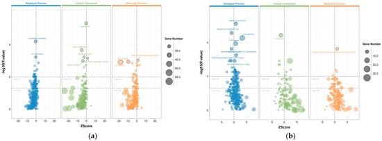 GO enrichment bubble plot assigned to DEGs in the Acd_p vs. Con_p (a) and Acd_w vs. Con_w (b). Con, control subjects; Acd, acidification groups; p, clams with purple shell color; w, clams with white shell color. GO enrichment analysis assigned DEGs to three different categories: biological processes (blue), cellular components (green), and molecular functions (orange). The x axis is Z-Score. Z-Score = (up − down)/(S0.5) shows the degree of difference in the number of up and down-regulated genes. The y axis is the −log10 value of p.value/q.value (adj p-value) for the GO enrichment analysis. Bubble color indicates the classification of GO. Information on significantly enriched bubbles is listed on the righthand side.