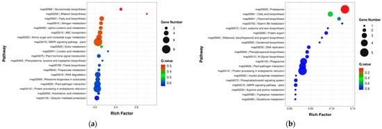 KEGG pathways in the enrichment analysis of M. veneriformis between Acd_p vs. Acd_w (a); Acd_w vs. Con_w (b); Con, control subjects; Acd, acidification groups; p, clams with purple shell color; w, clams with white shell color.