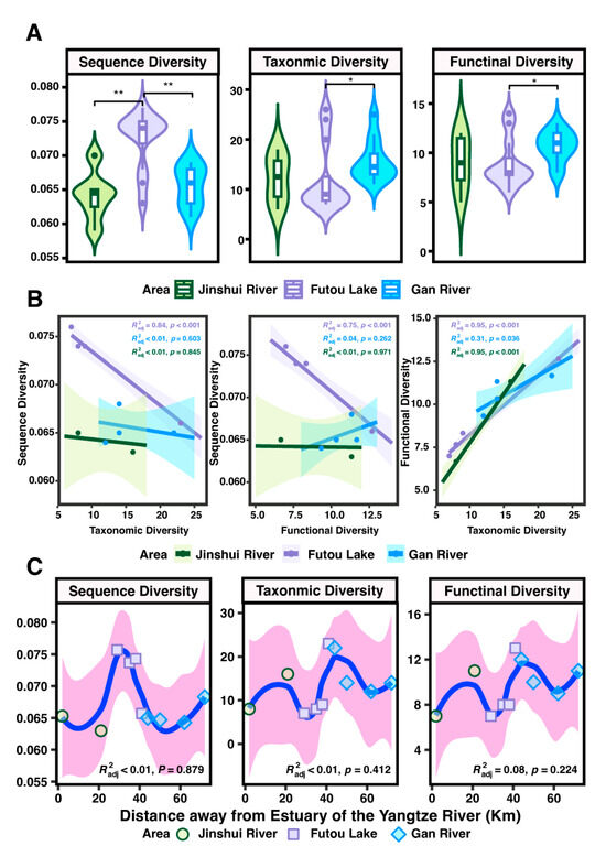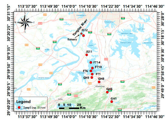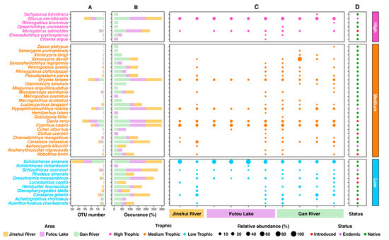 - Qian, M.-M.; Wang, Z.-Y.; Zhou, Q.; Wang, J.; Shao, Y.; Qiao, Q.; Fan, J.-T.; Yan, Z.-G. Environmental DNA Unveiling the Fish Community Structure and Diversity Features in the Yangtze River Basin. Environ. Res. 2023, 239, 117198. [Google Scholar] [CrossRef] [PubMed]