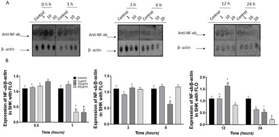 The dot blot results of NFκb proteins show that at 1, 6, and 12 h, protein concentrations increased compared to the control group, but at different FLO concentrations (Figure 4A,B).