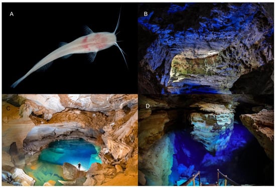 - Bockmann, F.A.; Castro, R.M.C. The Blind Catfish from the Caves of Chapada Diamantina, Bahia, Brazil (Siluriformes: Heptapteridae): Description, Anatomy, Phylogenetic Relationships, Natural History, and Biogeography. Neotrop. Ichthyol. 2010, 8, 673–706. [Google Scholar] [CrossRef]
