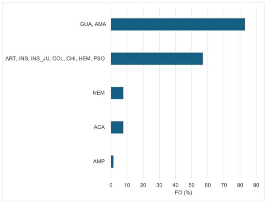 - Hyslop, E.J. Stomach Contents Analysis—A Review of Methods and Their Application. J. Fish Biol. 1980, 17, 411–429. [Google Scholar] [CrossRef]