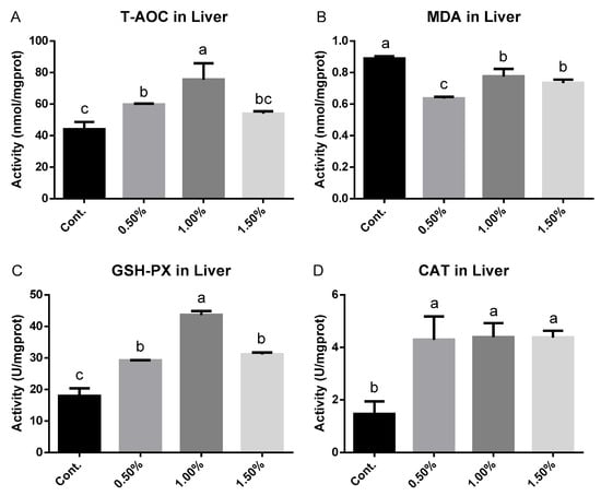 Antioxidant enzyme activity of M. albus liver in the different experimental groups. Different letters represent significant differences at p < 0.05; the same or no letter represents no significant difference (p > 0.05). Abbreviations: total antioxidant capacity (T-AOC), malondialdehyde (MDA), glutathione peroxidase (GSH-PX), catalase (CAT).