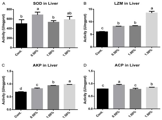 As shown in Figure 2, the LZM and AKP activity was increased in all groups when compared with the control, while the CGA 0.5% and CGA 1.5% groups presented higher ACP activity than the control group (p < 0.05). Moreover, the SOD activity of the liver was significantly augmented in the 0.50% CGA group (p < 0.05).