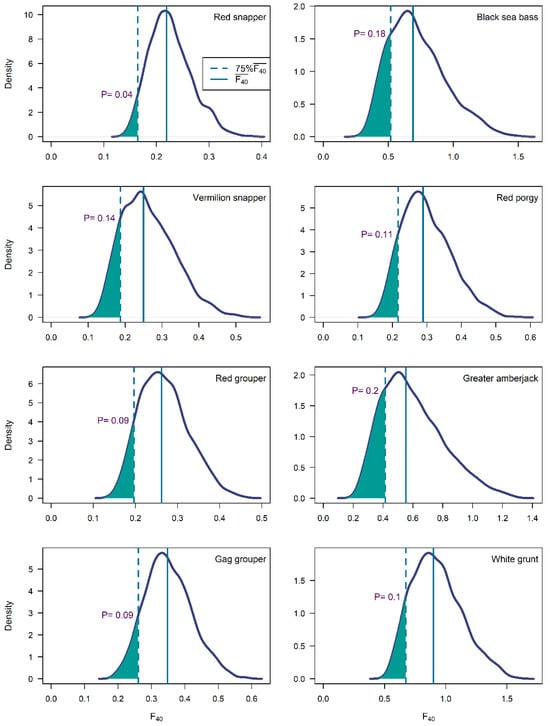 Whether using MSY, SPR, or some other metric, central to BRPs is the concept of limits and targets [,]. Limits represent the perceived maximum degree of sustainable exploitation, whereas targets represent the degree of exploitation aimed for by management. Limits should rarely be exceeded, which implies that when reference points are measured in F, the target should be no greater than the limit. In U.S. fishery management, FMSY is treated as a limit, and considerable attention has been devoted to evaluating appropriate proxies for FMSY, with a particular focus on SPR [,,,]. A common proxy for FMSY is F40, although the ideal level varies depending on life-history and fishery characteristics [,]. The target F would then be set at some value less than FMSY or its proxy to provide a buffer to prevent frequent overfishing. This could be accomplished using a fixed percentage of the limit, such as FTARGET = 75%F40, or it could be based on achieving pre-specified probabilities of overfishing [,].