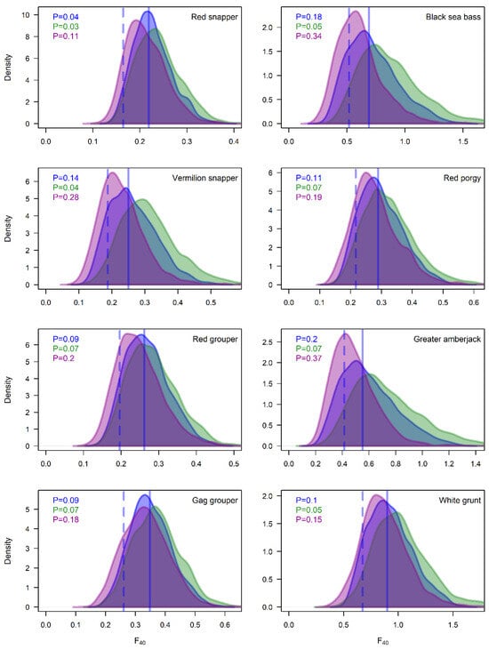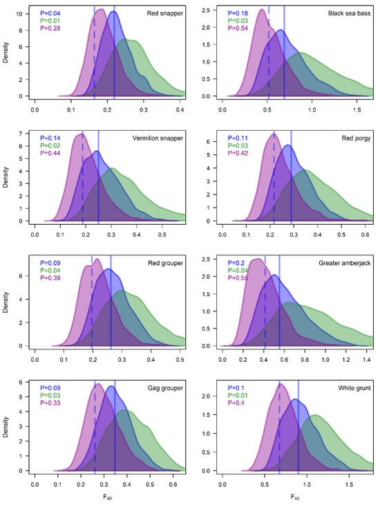 Probability densities of F40 for reef-associated species conditional on directional variability (±1 standard deviation) in the natural mortality rate. A decreased mortality rate shifts the density of F40 toward lower values (magenta), whereas an increased mortality rate shifts the density toward higher values (green), relative to the density with nondirectional variability (blue). The vertical lines correspond to F = (solid) and F = 75% (dashed) from prevailing conditions, with the probability of overfishing (P) for each distribution indicated in each panel.
