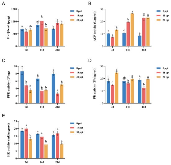 Values (mean ± SD) of intestinal biochemical indices of Nile tilapia (0 ppt is the control, the rest are experimental groups, the same below) for 7, 14, and 21 days. (A) IL-1β level; (B) ACP activity; (C) PFK activity; (D) PK activity; and (E) HK activity. Different letters indicate significant differences over different treatment groups (One-way ANOVA, p < 0.05).