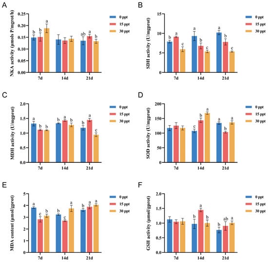 Brain energy metabolism and oxidative stress markers in Nile tilapia at 7, 14, and 21 days in different salinity environments. (A) NKA activity; (B) SDH activity; (C) MDH activity; (D) SOD activity; (E) MDA activity; and (F) GSH activity. Different letters represent significant differences between treatments (One-way ANOVA, p < 0.05).