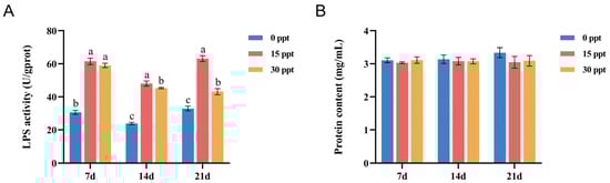 Effects of different salinity conditions on muscle-related indices of Nile tilapia at 7, 14, and 21 days (mean ± SD). (A) LPS activity and (B) Protein content. Different letters denote statistically significant differences between treatments, (p < 0.05).