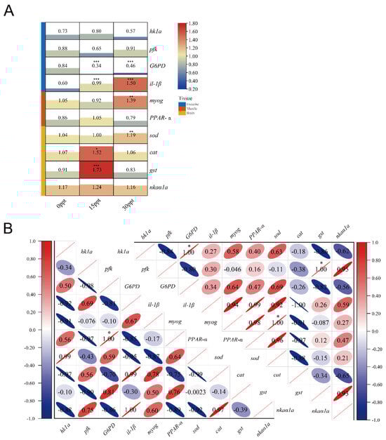 (A) Heat map of the relative mRNA expression levels in the intestine, brain, and muscle of Nile tilapia exposed to different salinities for 21 days. The numbers indicate the gene expression levels (* means p < 0.05, ** means p < 0.005, *** means p < 0.001). (B) Pearson correlation analysis of intestine, brain, and muscle genes in Nile tilapia at 21 days of exposure (left part is the 15 ppt group, right part is the 30 ppt group, ∗ indicates statistical significance).