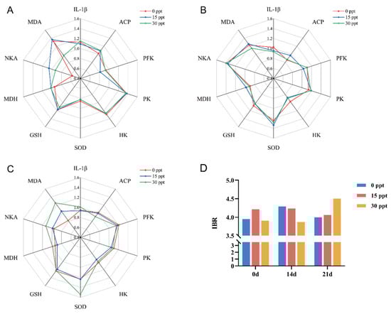 The IBR star plots are shown in Figure 5A–C. At 7 and 14 days, the 15 ppt group had the largest area of star plots and the IBR values were higher in the 15 ppt group in the histograms.
