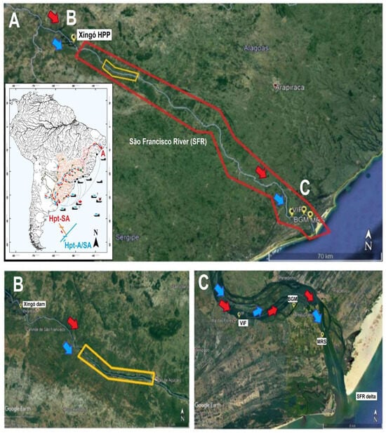 The São Francisco River (SFR) basin spans 2863 km and covers 639,219 km2, equivalent to 7.5% of Brazil’s national territory (Figure 1), and is located in the northeast area of South America (SA). The basin comprises four physiographic sectors: Upper, Middle, Sub-Middle, and Lower. Junqueira [52] describes the end portion of the basin as the Lower São Francisco River (LSFR). In the early 1960s, the course of the Piumhi River, a tributary of the Grande River (GR) at the head of the Paraná River (PR) basin, was reversed to the Upper sector of the SFR basin [53]. The LSFR basin covers a total area of 30,337 km2 and extends for 274 km (5% of the basin). It includes the area between the power plant complex in Paulo Afonso County (Bahia State) and its mouth in the Atlantic Ocean (see Text S1, Figures S1 and S2). Studies have shown that coastal stretches along the LSFR, specifically the SFR Delta, are undergoing erosion (see Text S1). The LSFR has a longitudinal gradient and fauna closer to an estuarine environment than an estuary. The reduction and regulation of the flow resulting from the various dams along the course of the SFR, especially the Xingó dam located just 180 km from the mouth, probably caused the salt wedge intrusion [54]. The alterations to the ichthyofauna assessed in [54] illustrate the changes caused by river damming in this region. Notably, this region has no reports of intercontinental port activity (see Text S1).