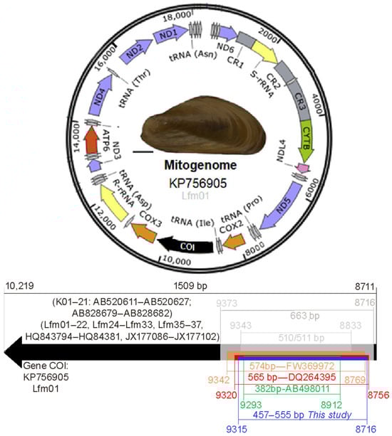 Shell morphology (conchology) and molecular tools are currently utilized to identify golden mussels [39,40,41]. Molecular tools have become increasingly crucial in bioinvasion studies [42]. They aid mitigation efforts and provide baseline data on the structure of golden mussel populations [28,40,43,44,45,46,47,48]. Research on the population structure of the golden mussel indicates that the initial L. fortunei propagules were introduced to Argentina and Brazil via ballast water from Japan and Korea [44,45]. To analyze the evolutionary processes related to each animal model, COX1 barcode haplotypes are necessary for population genetics [49,50,51], and fragmentation standards of 600 to 800 bp should be maintained [50]. The absence of these conditions can lead to the emergence of artifacts that affect the comparison or identification of haplotypes within a given species [50]. Haplotypes of L. fortunei COX1 barcode have been identified in Asia and SA [28,43,44,45,46,47,48]. Reports indicate that exclusive haplotypes derived from Asia [48] share ancestral haplotypes (Lfm03) from Asia. Additionally, exclusive haplotypes (Lfm04) from SA populations have been observed [28,44,45,46].