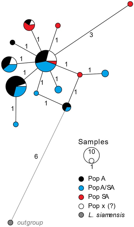 - Leigh, J.W.; Bryant, D. POPART: Full-feature software for haplotype network construction. Methods Ecol. Evol. 2015, 6, 1110–1116. [Google Scholar] [CrossRef]