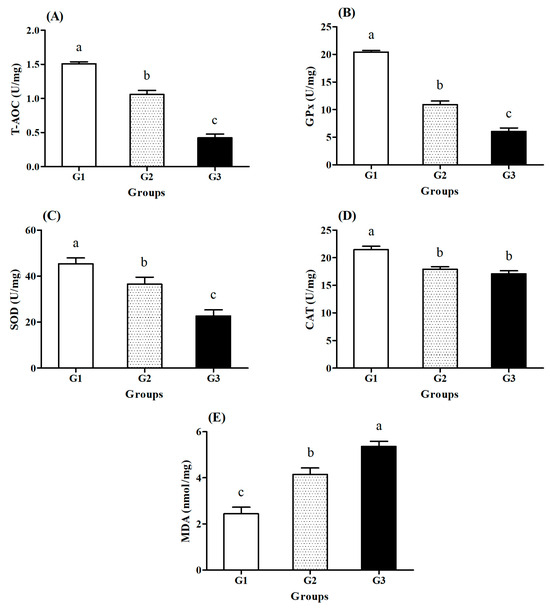 The antioxidant enzyme levels in the livers of the fish are presented in Figure 2. The T-AOC, SOD, GPx, and CAT contents of fish in the stress groups were significantly lower than those in the control group (p < 0.05). However, the MDA level of fish in the control group was significantly lower than that in the stress groups (p < 0.05).