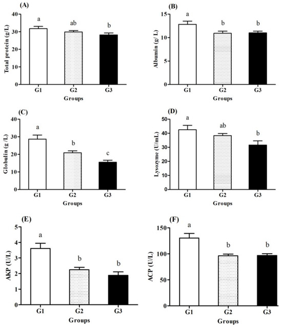 Plasma immune parameters consist of total protein (TP), albumin, globulin, lysozyme, acid phosphatase (ACP), and alkaline phosphatase (AKP) contents. Plasma total protein and albumin content were measured by the Biuret and BCG dye binding method and the bromocresol green binding method [26]. Lysozyme activity was estimated using the turbidimetric assay according to Obach et al. [27]. ACP and AKP activities were analyzed according to a disodium phenyl phosphate method [28].